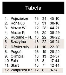 Zespół z Rucianego przyjechał do Zabiel z bardzo krótką ławką rezerwowych, nie dokonał żadnej zmiany, a mimo tego rozgromił gospodarzy. Bramkę na otarcie łez zdobył dla Wałpuszy Gleba, który wykorzystał podanie Kostrzewy. To już dwunasta porażka podopiecznych Cezarego Kucińskiego w sezonie. W najbliższy weekend drużyna z Jesionowca zmierzy się w derbowym pojedynku z GKS-em Szczytno.