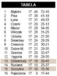 Mecz w Rucianem rozgrywany był na błotnistym boisku i przy wietrznej pogodzie, co przełożyło się na poziom pojedynku. - Dźwierzuty zagrały na trójkę – stwierdził po meczu trener GKS-u Jarosław Szpyrka. Ciekawe, czy ocena byłaby taka sama, gdyby w doliczonym czasie Filipiak, wykorzystując podanie Marszałka, nie doprowadził do wyrównania. Wcześniej gospodarze mądrze się bronili, a dwukrotnie od straty gola ratował ich słupek.