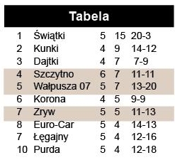 Korona Klewki – Świątki Skolity 0:5, SKF Kunki – KS Łęgajny 7:2. Pauzowały: Dajtki Olsztyn, KP Purda.