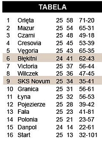 Sokół Ostróda - SKS Novum Szczytno 1:9 (0:2); br.: Nikodem Cegielski (20., 30.), Maciej Ochtera (42.), Kamil Komorowski (48., 53., 65., 70.), Mateusz Nagadowski (73.-k.), Michał Biernacki (77.)