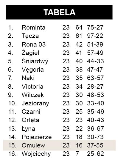 Do zakończenia sezonu zostało jeszcze siedem kolejek, ale w przypadku Omulwi każdy mecz jest spotkaniem o wszystko. W sobotę wrażenie nieco bardziej zdeterminowanych sprawiali gospodarze, którym bieżący sezon także trudno uznać za udany. Zespół odgrywający zazwyczaj w lidze ważniejszą rolę tym razem walczy o utrzymanie i do celu ma bliżej, niż nasza drużyna. Między słupki wielbarskiej bramki powrócił Przybysz. Kilkakrotnie popisał się udanymi interwencjami, ale w 61. min jedyny raz skapitulował. Doszło do tego w dość pechowych okolicznościach. Piłkę, która nie zmierzała w światło bramki, usiłował wybić Janowski. Ta jednak podskoczyła na kępie, uderzyła w nogę zawodnika Omulwi i wpadła tuż przy słupku.