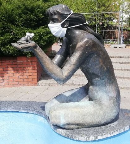 Społeczeństwo zasadniczo podporządkowało się maseczkowemu nakazowi, choć ten czy ów o tej formie zabezpieczenia zapomina lub chce udawać bohatera. W ramach żartobliwego przypomnienia o obowiązku w niektórych miastach maseczki założono na oblicza postaci na lokalnych pomnikach. Pewne znajome małżeństwo przysłało nam zdjęcie z Giżycka. Przed koronawirusem chronią się tu postacie z miejscowej legendy – dziewczyna i żaba. Ta druga ma maseczkę w wersji XXS (fot. 7). Przegapiliśmy maseczkę u naszego Klenczona (podobno miał, ale ostatnio nie widzieliśmy). Sienkiewicz pewnie by się nie obraził (aczkolwiek to noblista), Janowi Pawłowi II, choć miał duże poczucie humoru, zakładać by nie wypadało, ale trochę bezczynne są w zastanej sytuacji nasze pofajdoki. Niektórym, z racji przyjętej pozy, nałożyć maseczkę byłoby trochę trudno (fot. 8), ale przecież w Szczytnie mamy całą wesołą gromadkę tych postaci i czemu w ramach akcji promocyjno-profilaktycznej z tego by nie skorzystać?