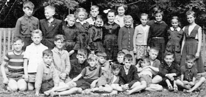 Drugie zdjęcie, to cała nasza klasa V „B”. Zrobione zostało na zakończenie roku szkolnego, w czerwcu 1958. Stanęliśmy prawie wszyscy z klasy, na końcu boisku szkoły. Po lewej stronie w koszulce w paski ja klęknąłem.