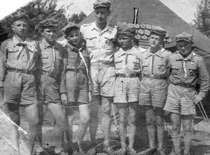 Trzecie zdjęcie nie jest bezpośrednio związane ze szkołą, ale z wakacjami i obozem harcerskim. Uwidoczniony na nim jest mój zastęp harcerski na obozie w Rucianem – Nidzie w lipcu 1958 roku. Od lewej stoją: Zbyszek Augustynowicz, Leszek Mierzejewski, Marek Dzieniakowski, Zastępowy Ostaszewski, Mietek Soliwoda, Kazimierz Kosakowski i zapomniałem godności ostatniego z druhów.
