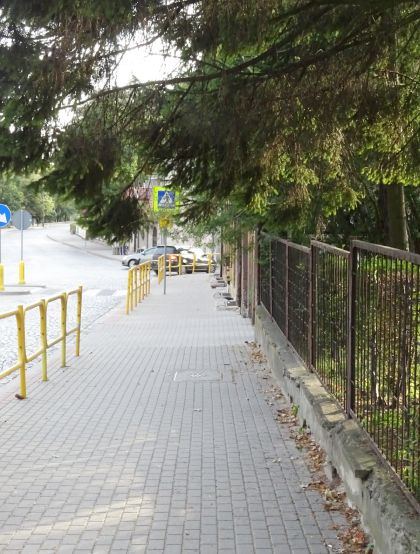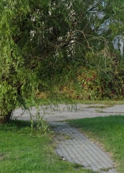 Rekordowo nisko zwisają gałązki wierzby rosnącej w pobliżu skrzyżowania ulic Leśnej i Osiedleńczej (fot. 10). Część płoży się po chodniku, część znajduje się parędziesiąt centymetrów nad nim. Miejsce to wygląda podobnie od paru ładnych tygodni i najwyraźniej nikomu odpowiedzialnemu za bezpieczeństwo i komfort przechodniów to nie przeszkadza.