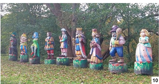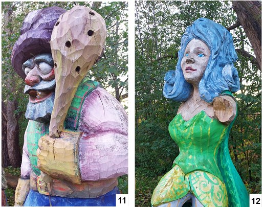 Gdy ostatnio spacerowaliśmy ścieżką wokół Jeziora Domowego Dużego, postanowiliśmy się przyjrzeć z bliska stanowi kolorowych baśniowych rzeźb (fot.10) , które od paru lat stoją w szeregu tuż przy plaży miejskiej. Są one efektem plenerów malarskich, których dobrym duchem był zmarły dwa lata temu Michał Grzymysławski. On też na owe rzeźby nanosił farbę, czym podkreślił ich baśniowy charakter. Niestety, czas wraz z warunkami atmosferycznymi zrobił swoje. Swoje dodali też wątpliwej jakości dowcipnisie. O ile z daleka, bez dokładniejszego przyglądania się poszczególnym postaciom, raczej niewiele złego zobaczymy, to z bliska pewne ubytki będą już bardziej widoczne. Postać nazwana zbójem straciła coś ze swej maczugi (fot. 11). Postać na nadmiar zębów nie narzeka (to już zamysł rzeźbiarza), ale akurat między jedynymi dwoma zębami tkwi wsadzony pet . Pewna postać kobieca straciła sporą część ręki (fot. 12) i wygląda – choć odziana – niczym Wenus z Milo. Różnych ubytków jest więcej i po prostu... szkoda tych rzeźb, szkoda czyjejś pracy. Po śmierci Michała znikła z MDK-u pracownia rzeźby i najwyraźniej brakuje kogoś, kto mógłby o spuściznę po zmarłym artyście odpowiednio zadbać.