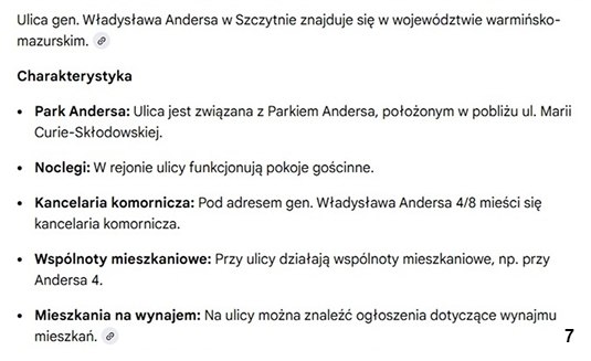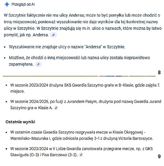 Od paru lat coraz częściej stykamy się z AI (sztuczną inteligencją) oferującą cały szereg udogodnień. Niektórzy nie mogą się bez niej obyć, inni obawiają się choćby tego, że... pozbawi ich pracy. O tym, że AI nie jest alfą i omegą i nie zawsze sobie poradzi ze stosunkowo prostymi zadaniami, przekonać się łatwo. Od pewnego czasu AI wyskakuje nam jako jeden z elementów na pasku zadań w laptopach czy telefonach. Z ciekawości zadaliśmy sztucznej inteligencji pytanie, czy w Szczytnie istnieje ulica Andersa. Otrzymaliśmy dość zaskakujące odpowiedzi. Odzew na wpis „Szczytno ul. Andersa” widzimy na fot. 7 . Dla AI Anders to Anders i stąd powiązanie Richarda Andersa z generałem Władysławem Andersem. Gdy pozwoliliśmy sobie wpisać do wyszukiwarki stwierdzenie „W Szczytnie nie ma ul. Andersa”, w przeglądzie od AI wyskoczyło nam potwierdzenie tej błędnej przecież tezy (fot. 8). Nieco dziwne informacje uzyskamy także na temat np. występów Gwardii Szczytno (fot. 9) . Pod spodem pojawia się dopisek, że odpowiedzi wygenerowane przez AI mogą zawierać błędy. Pozostaje zatem kierowanie się własnym rozumem i posiadaną wiedzą...