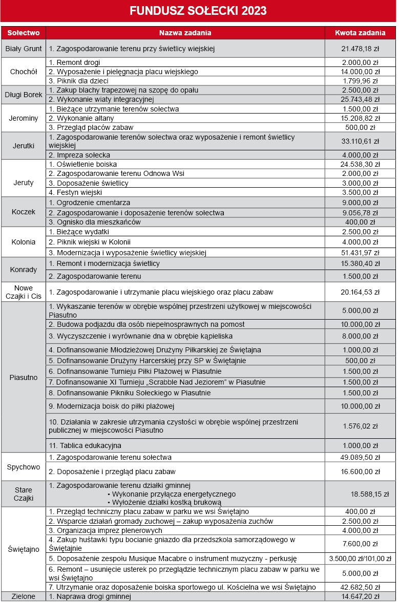 W Jerutkach i Kolonii mieszkańcy zdecydowali się m. in. na remont świetlic. W Spychowie będą chcieli odnowić stojący w centrum wsi przystanek, naprawić deski na scenie w amfiteatrze i postawić tam rzeźbę Juranda. W Świętajnie najwięcej środków zostanie przeznaczonych na utrzymanie i doposażenie boiska sportowego. Przewidziano w tym remont trybun zdewastowanych przez wandali. Materiały zakupi gmina, a do wykonania robót zobowiązali się miejscowi sympatycy sportu. Z kolei w Piasutnie zaplanowano aż 11 zadań, w większości związanych z estetyką i rekreacją.