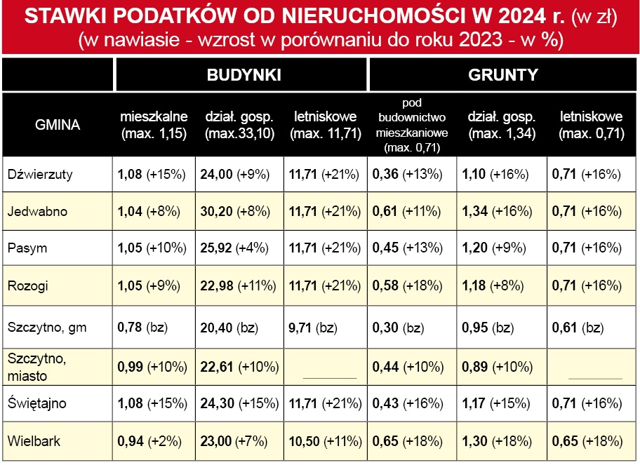 W nowym roku w większości szczycieńskich samorządów wzrosną stawki podatku od nieruchomości. Tylko w jednym przypadku – gruntów dla prowadzących działalność gospodarczą w gminie Jedwabno – będą one na maksymalnym, dopuszczonym przez ministra finansów poziomie. W pozostałych przypadkach uchwalone stawki są niższe od ministerialnych od kilku, do nawet 60 procent.
