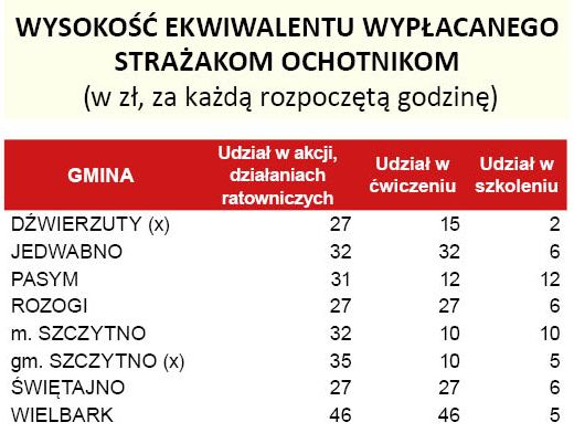 Radni Gminy Szczytno podczas obrad w ubiegłą środę podjęli uchwałę dotyczącą ekwiwalentu wypłacanego strażakom z jednostek OSP działających na terenie gminy Szczytno. Tak jak dotychczas będzie on wypłacany za udział w akcjach i działaniach ratowniczych. Stawka za każdą rozpoczętą godzinę wzrośnie z 25 do 35 zł. W przypadku uczestnictwa w ćwiczeniach wyniesie ona 10 zł, a za udział w szkoleniach - zmniejszy się z 8 do 5 zł. Do tego dojdą nowe pozycje. {akeebasubs !*}