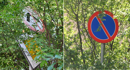 Pisaliśmy już o tym w zeszłym roku, ale nic się w tej kwestii nie zmienia i ponownie nasi czytelnicy zwracają nam uwagę na doskonale maskowane znaki drogowe na ul. Podgórnej. Jeśli poruszamy się tą ulicą w kierunku centrum miasta, przed skrzyżowaniem z ul. Bartna Strona zauważamy po lewej stronie gęsty szpaler drzewek, no i nic ponadto. Tymczasem w opisywanej zieleni tkwią, doskonale zamaskowane, aż trzy znaki drogowe. Zaraz za ażurowym słupem energetycznym stoi podwójny znak – zakaz skrętu w lewo oraz droga z pierwszeństwem przejazdu. Za nimi na końcu szpaleru stoi kolejny – zakaz parkowania. Najprościej byłoby znaki zakazu skrętu oraz droga z pierwszeństwem przejazdu umieścić na słupie. Z kolei znak zakaz parkowania stoi pośród drzewek raczej bez sensu, bo tuż przed skrzyżowaniem. Te, jak wiadomo, odwołuje wszelkie znaki.