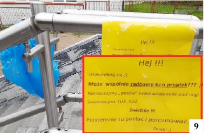 Niedawno oddane do użytku schody prowadzące nad mniejsze ze szczycieńskich jezior (albo pozwalające wspiąć się na ul. Konopnickiej) wciąż wzbudzają emocje. Ostatnio wiążą się one z poruszaną także przez nas sprawą palenia na nich papierosów przez młodzież i pozostawiania niedopałków. Jakoś nie pomogło ustawienie tuż przy schodach kosza na śmieci – pety bardzo często lecą na ziemię i nawet jeśli nie leżą na samych schodach, tylko poza murkiem, to pogarszają estetykę tego miejsca. Głęboko wierzymy, że palacze nie korzystają w domach z popielniczek, lecz gaszą resztki papierosa na dywanie, panelach czy ceramicznych płytkach. Problem irytuje nie tylko nas, ale i inne osoby. Świadczy o tym sympatyczna w tonie treść pewnego tekstu, który umieszczono na kartce wywieszonej na poręczy rzeczonych schodów (fot. 9). Może to przemówi do rozumu najbardziej opornym. Nie wiemy, kto dodał foliowy woreczek, który znalazł się obok kartki. Cel jest szlachetny, woreczek jest częściowo wypełniony, ale akurat ten rekwizyt wygląda tu nie najlepiej.