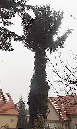 A może by tak pomyśleć o przystrojeniu tych drzew w okresie świątecznym? Więcej świerków czy jodeł, niekiedy dość wysokich, zobaczymy w strefie zabudowy jednorodzinnej. Są takie uliczki, gdzie praktycznie przy każdym domostwie posadzono iglaki. Naszą uwagę przykuło pewne rosłe drzewo, które niemal aż po czubek jest oplecione bluszczem. Dopiero na znacznej wysokości pojawiają się gałęzie. Widok taki do podziwiania na skrzyżowaniu ulic Bohaterów Westerplatte i Kochanowskiego (fot. 7).