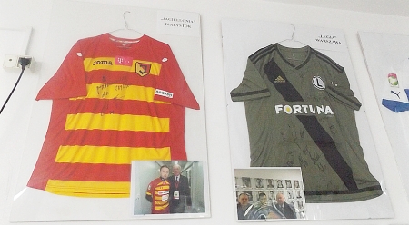 Świąteczną atmosferę czuć oczywiście również w hali im Wagnera. Choinki mamy tam i na zewnątrz, i wewnątrz, a całość uzupełnia jeszcze postać mikołaja. Nie na tym jednak chcielibyśmy się skupić. Od kilku lat w halowym holu rozrastają się galerie… nie, nie handlowe, tylko sportowe. Jak mówi nam Arkadiusz Leska, kierownik hali Wagnera, gdy do budynku wchodzą dziadkowie z wnukami, ich uwaga skupia się od razu na sporym akwarium i galerii piłkarskich koszulek. Te umieszczone zostały w antyramach. Dziś koszulki te pozyskiwane są w różny sposób, ale wszystko się zaczęło od strojów przywożonych przez prezesa SKS-u Szczytno Zbigniewa Magnuszewskiego, który do niedawna był związkowym delegatem odpowiedzialnym za bezpieczeństwo na stadionach. W weekendy - i nie tylko - dość regularnie bywał na meczach polskich drużyn, w tym ekstraklasowych. Jedną z pierwszych wyjazdowych „zdobyczy” była koszulka w barwach Jagiellonii Białystok, a do piłkarskiego wdzianka dołączona jest wspólna fotografia z ówczesnym zawodnikiem Jagiellonii Tomaszem Frankowskim. Obok koszulki z Białegostoku znajduje się najnowszy nabytek, czyli strój Legii Warszawa z autografami piłkarzy obecnego mistrza Polski (fot.9).