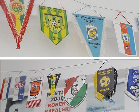 Całość kolekcji obejmuje obecnie 29 koszulek, z czego 9 pochodzi od klubów grających w tym sezonie w Ekstraklasie. W MOS-ie liczą na pozyskanie kolejnych strojów, o czym mogą świadczyć wiszące już trzy (na razie puste) antyramy. W holu trudno nie zwrócić uwagi także na proporczyki różnych drużyn, także z niższych lig. Tego typu pamiątek jest w pobliżu wejścia do hali Wagnera circa dwa razy więcej niż koszulek. Każdy może wybrać swojego faworyta, ale kibice ze Szczytna nie powinni nie zauważyć proporczyków naszych futbolowych zespołów – nawet tych nieistniejących. (fot. 10)
