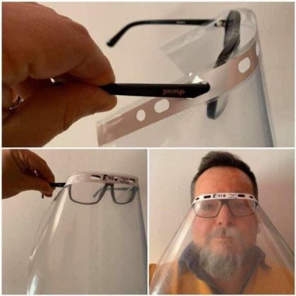 Część sprzedawczyń, zamiast maseczek, zakłada w celach ochronnych XXI-wieczne prześwitujące przyłbice. Prostszy (i tańszy) wynalazek zgłosił do opatentowania na łamach „Kurka” nasz Czytelnik pan Tadeusz Bogusz. Taką osłonkę dla niezamożnych można sobie skonstruować z okularów i… koszulki A 4 do dokumentów (fot. 11). Dla tych, którzy okularów nie noszą, wystarczy odpowiednia przepaska – i ruszamy w miasto. Oczywiście, jeśli mamy ważny powód. Musimy dodać, że koszulkę trzeba wybrać stosowną do sytuacji, mocno przezroczystą, czyli nadającą się do patrzenia. Chcieliśmy z marszu wykorzystać koncept naszego Czytelnika, na okulary przeciwsłoneczne (tak dla bajeru) nawlekliśmy pierwszą z brzegu koszulkę, ale akurat przez nią widzieliśmy jak przez mgłę.