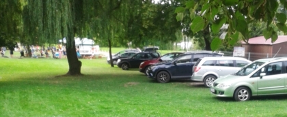 Wiadomo, że pojazdy uprzywilejowane wjeżdżają w razie potrzeby tam, gdzie inni wjeżdżać nie powinni – i jak najbardziej można to zrozumieć. Nie zdziwią przecież np. karetka na boisku piłkarskim, stojąca na przyblokowym trawniku straż pożarna, która gasi ogień, ewentualnie samochód policyjny ścigający przestępcę po polu. Na zdjęciu widzimy, że akcja nie jest jakoś szczególnie spektakularna, z relacji autora fotografii nie wynika, że legitymowany stanowił jakieś zagrożenie itp. Dosłownie kilka metrów dalej znajduje się przysklepowy parking, ewentualnie można było zatrzymać pojazd na ulicy (parę metrów w lewo). No, ale może takie są teraz najnowsze trendy w procedurach – zaskoczyć zatrzymywanego w jakiś niekonwencjonalny sposób. Ktoś powie, że np. na trawę w parku za ul. Spacerową wjeżdżają bez skrępowania pojazdy towarzyszące wakacyjnej weekendowej imprezie „Wyspa twórczej zabawy i aktywnego wypoczynku” (fot. 2). Tylko czy takie chyba nie do końca potrzebne wjeżdżanie ma – podobnie jak potrzebny i udany cykl programów dla dzieci – wartość dydaktyczną?