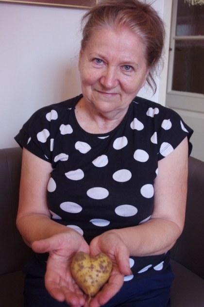 Pani Zofia opowiada, że ziemniaki uprawia w swoim ogródku od czterdziestu lat, podobnie długo dogląda rosnących tu innych warzyw, jarzyn i owoców. Dotąd nie spotykała tak nietypowo wyglądających okazów. – Może kiedyś takie (czyli w kształcie serca) truskaweczki były – przypomina sobie.