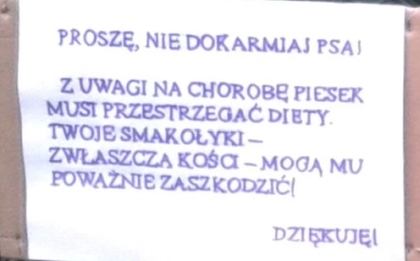 Nieco inną sytuację zastaliśmy na ul. Konopnickiej w Szczytnie. Jak się dowiedzieliśmy, sporą popularnością cieszy się tu spory rudawy piesek. Na podwórzu ma on swoją budę, która jest połączona liną z rosnącym bliżej siatki ogrodzeniowej drzewem. Wokół liny zapętlony został drugi koniec smyczy – i w ten sposób pies może sobie sam po podwórku spacerować. Gdy byliśmy tam kilka razy, zwierzę widzieliśmy leżące przy ogrodzeniu (fot. 7). Najwyraźniej kusi to osoby przemieszczające się po chodniku do dokarmiania psa – choć ma on przecież swoich właścicieli. Być może dokarmiający kierowali się tym, że piesek sprawia wrażenie osłabionego i zmęczonego. Właściciel wywiesłi niedawno na siatce kartkę treści widocznej na fot. 8. Dla dobra pieska kości i inne psie smakołyki nie powinny być już tam wrzucane.