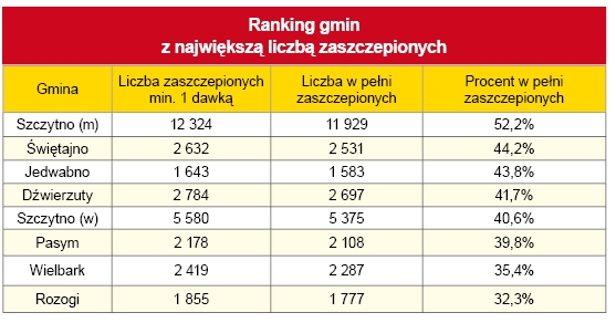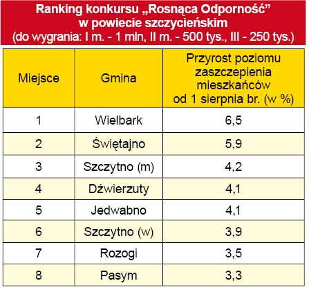 Najbardziej atrakcyjny dla samorządów konkurs „Rosnąca Odporność” premiuje gminy, które osiągną najwyższy wzrost poziomu zaszczepienia swoich mieszkańców pomiędzy 1 sierpnia a 31 października br. W każdym powiecie gminy mogą zdobyć atrakcyjne nagrody: • 1. miejsce: 1 mln zł, • 2. miejsce: 500 tys. zł, • 3. miejsce: 250 tys. zł. Mimo takich zachęt znaczących wzrostów w tym czasie w powiecie szczycieńskim nie odnotowano, a samorządy robią co mogą, uruchamiając np. mobilne punkty przy okazji organizowanych na ich terenie masowych imprez.{akeebasubs !*}