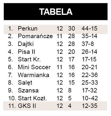 Bramki dla Perkuna: Michał Filipiak (25., 81.), Dominik Olszewski (38.)