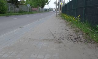 Żeby nie było, że nie doceniamy czyichś starań – wracamy do kwestii ul. Gnieźnieńskiej. O przewlekle zapiaszczonym chodniku na jej końcowym odcinku pisaliśmy kilkakrotnie – ostatnio w kwietniu. I oto – prawie cud. Zobaczyliśmy go, gdy z czystej ciekawości przejechaliśmy się w miniony weekend tą ulicą. Na chodniku zrobiło się nieoczekiwanie czysto (fot. 9). Piach leżał naprawdę długo i jego dolna warstwa zaczęła przypominać cement, bo tu i ówdzie zbryłowane resztki zostały. Zarządca drogi uznał jednak, że w jego gestii nie leży doprowadzenie do odpowiedniego stanu całego chodnika. Prace porządkowe w pewnym momencie zostały zakończone (fot. 10). Konkretnie tam, gdzie trotuar przylega do czyjegoś ogrodzenia i nie jest oddzielony pasem zieleni. Pas zieleni wyrósł za to na zaniedbanym chodniku, na co powinien zwrócić uwagę już ktoś inny, bo takie są przepisy.