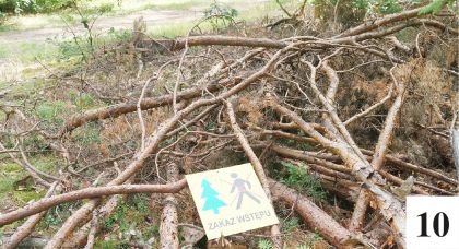 Po pracy zawsze warto posprzątać, ale niekiedy o tym się zapomina. Kiedyś widzieliśmy siekierę pozostawioną po ścięciu wysokiego iglaka w parku na ul. Pasymskiej. Teraz w lesie niedaleko Sędańska i Janowa od prawdopodobnie ubiegłego roku leży sobie tabliczka ostrzegawcza (fot. 10). Przeprowadzano wówczas trwającą parę miesięcy wycinkę. Najwidoczniej robotnicy leśni nie powiedzieli jeszcze ostatniego słowa i chcą w to samo miejsce wrócić…