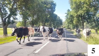 Okres wakacyjny sprzyja wyjazdom, a kierunki są rozmaite. Nie wszystkie wyjazdy muszą mieć charakter typowo turystyczny – niektórzy odwiedzają np. swoich bliskich. Podróże, jak wiadomo, kształcą, a nierzadko dostarczają ciekawych przeżyć. Pewne małżeństwo ze Szczytna w minioną sobotę udało się na jednodniowy wyjazd za Ostrołękę. Korzystało z wciąż remontowanej w Rozogach i okolicach drogi krajowej nr 53. Kawałek za Myszyńcem, gdzie poważniejszych remontów na razie nie ma (a zdecydowanie by się przydały) napotkali dość nietypowy, jak na drogę krajową, widok (fot. 5) . Dodajmy, że nie były to ani wczesne godziny poranne, ani późniejsze popołudniowe, a właściciel krowiego stada swoim zwierzętom nie towarzyszył… Zwierzęta nie były zainteresowane uszkodzeniem samochodu i po kilkudziesięciu ruszył on w dalszą drogę.