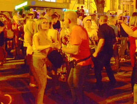 objazdów, a w najbardziej newralgicznych miejscach pojawili się policjanci ręcznie kierujący ruchem. Mimo to w godzinach szczytu i tak tworzyły się korki, m.in. w okolicy przejazdu na ul. Warszawskiej. Zatłoczone były także boczne uliczki, dodatkowo zablokowane parkującymi tam samochodami przybyłych na imprezę turystów. Od piątkowego południa na wyłączonej z ruchu ul. Odrodzenia pojawiły się stragany oraz stoiska gastronomiczne. W tym roku sporym wzięciem cieszyły się szpetne plastikowe maski oraz nowość niespotykana dotąd w takiej skali - koszulki z narodowymi hasłami.