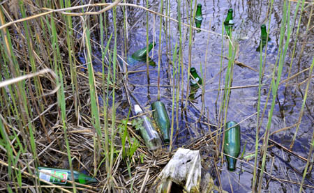 Nad dużym jeziorem za plażą miejską, jeślibyśmy spacerowali w kierunku Korpel, natrafimy na małą dziką plażę czy też przystań dla łódek. Taki sielski widoczek, bo w tle z osiedlem w Kaminonku, roztacza się na tyłach kompleksu handlowego powstałego niedawno przy ul. Pasymskiej, naprzeciw przedszkola „Bajka”. Jednak jest to tylko z pozoru sielski obrazek. Za łódkami rozciąga się bowiem śmieciowisko, a w wodzie pływają liczne butelki po piwie – ktoś sobie urządził tutaj „majówkę” z procentami. Po opróżnieniu butelek, jak widać, wrzucano je do wody i pływają one teraz niczym wielkie spławiki. Oto przykład majowej, nadjeziornej rozrywki bałaganiarzy.