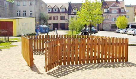 stronie alejki urządzono inny miniplacyk do zabawy wraz z piaskownicą. Właśnie ona została okolona drewnianym płotkiem, co pokazuje zdjęcie. Niewiele on pomaga, bo mali użytkownicy zajęci zabawą nie mają głowy do zamykania furtki, wskutek czego pieski mogą bez problemu wejść do środka i wiadomo co tam zrobić. Wniosek stąd płynie taki, że radą na czysty piasek nie są płoty czy parkany, ale wyższa kultura nie tyle czworo- co dwunogów, czyli posiadaczy piesków. Co roku na początku maja z okazji wesołej wystawy zwierzaków zwracana jest na to uwaga, ale jakoś mało kto bierze sobie te apele do serca, no i tu jest właśnie pogrzebany pies, czyli sedno sprawy. Na niewiele też zdają się urządzenia typu psie toalety. W zasadzie stoją one sobie, a muzom i omijane są szerokim łukiem przez właścicieli czworonogów.