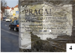 Przed chwilą było między innymi o wywieszonych informacjach, które straciły swoją ważność, teraz o innym zdezaktualizowanym przekazie. Jeszcze trochę i minie rok od momentu przyklejenia na iluś słupach oświetleniowych w Szczytnie karteczek zachęcających do pracy przy zbiorze truskawek (fot. 4). Karteczki, lekko już podniszczone wpływem warunków atmosferycznych, najwyraźniej nikomu odpowiedzialnemu za porządek w mieście nie przeszkadzają. Nawet gdyby ktoś uzyskał zgodę na przyklejenie czegoś takiego poza tablicą ogłoszeń, powinien to dawno temu usunąć.