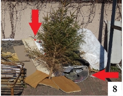 Lustra drogowe to temat bardzo wdzięczny, dlatego na koniec do niego powracamy. Parę ładnych tygodni temu ktoś (a może było to coś) wyłamał zasadniczą część owego urządzenia bezpieczeństwa stojącego na skrzyżowaniu szczycieńskich ulic Konopnickiej i Korczaka (fot. 7) . Lustro dość szybko wymieniono, ale zniszczone elementy znalazły swój azyl pod śmietnikiem na ul. Wańkowicza, czyli kawałek dalej. I w miniony weekend wciąż tam leżały (fot. 8), mając jako towarzyszkę mocno już poświąteczną choinkę…