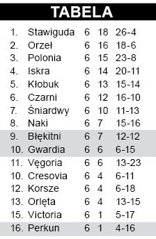 Trener Cezary Kuciński mógł zabrać na mecz z solidną drużyną z Narzymia tylko czternastu piłkarzy, z których de facto do gry nadawało się trzynastu. Zabrakło wielu kluczowych zawodników, w tym tych, którzy rywalizowali w niedawnych derbach z Błękitnymi. Ku ogólnemu zdziwieniu gwardziści zagrali nad wyraz dobrze. – Mecz w pierwszej połowie był pod naszą kontrolą. Szybko zdobywaliśmy teren – mówi szkoleniowiec szczytnian. Jako pierwszy do siatki mógł trafić Maciej Balcerzak, jednak po jego strzale z rzutu wolnego piłka minęła w mur i uderzyła w słupek. Na listę strzelców wpisał się za to nieco później dobrze grający Krzysztof Bałdyga. Konieczność występu w niedzielnym meczu juniorów sprawiła, że mógł on wrócić na boisko po przerwie. Chwilę po zmianie stron błąd w defensywie sprawił, że Iskra doprowadziła do wyrównania. Gwardziści mieli jeszcze swoje okazje, ale do siatki trafiali tylko rywale. – W tym meczu zabrakło nie siły, tylko cwaniactwa – twierdzi trener Kuciński. – Mimo wszystko dawno nie byłem tak zadowolony z gry, jak po tym spotkaniu – dodaje. W najbliższą sobotę Gwardia zmierzy się na własnym obiekcie z Perkunem Orzyny i będzie to dla szczytnian okazja do odkucia się za niedawną przegraną w spotkaniu pucharowym.
