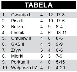 Czwarta seria spotkań nie przyniosła większych przetasowań w tabeli. Pozycję lidera utrzymały rezerwy Gwardii. Szczytnianie pod koniec pierwszej połowy meczu z Leśnikiem mieli gorszy moment i w ciągu paru minut niemal roztrwonili trzybramkową przewagę, ale po zmianie stron udowodnili swoją wyższość. W derbach w Wielbarku mniej interesująca była pierwsza odsłona, ciekawsza – druga, a mecz zakończył się zasłużonym zwycięstwem Omulwi II. W Jedwabnie reaktywowany Zryw skończył krótką serię meczów bez porażek – rezerwy IV-ligowej Pisy były zbyt wymagającym przeciwnikiem. Wciąż bez punktów pozostają: Wałpusza i Perkun II. Rezerwy beniaminka klasy okręgowej wprawdzie odrobiły dwubramkową stratę do gospodarzy, ale w samej końcówce zespół z Mierek przechylił szalę zwycięstwa na swoją stronę. Co ciekawe, wszystkie bramki do stanu 2:2 padały po rzutach karnych.{/akeebasubs}