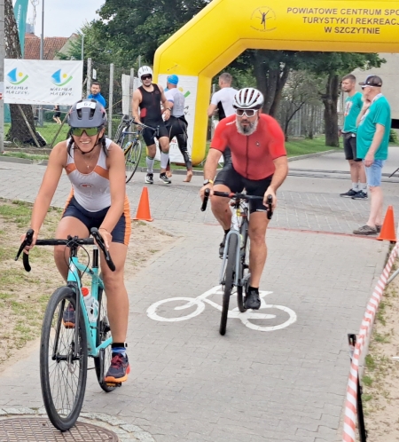 Jako pierwszy na mecie pojawił się Kamil Rybus z Łowicza, uzyskując czas 2 godziny 36 minut i sześć sekund. To był jego pierwszy start w Szczytnie i jednocześnie pierwsze zawody na takim dużym dystansie. Przygotowywał się do nich od tygodnia, m. in. jeżdżąc rowerem po pobliskich terenach. - Jest tu bardzo dużo fajnych szerokich i szybkich szutrowych dróg, gdzie też można byłoby zrobić odpowiednią do triathlonu trasę rowerową – mówi zwycięzca. Do tej, której przyszło mu pokonać nie ma zastrzeżeń. Na co dzień pracuje w laboratorium pomiarowym w Łowiczu, zajmując się wzorcowaniem obiektów. - Trenuję co drugi dzień w towarzystwie kilku innych zapaleńców triathlonu, nakręcając się wzajemnie – zdradza Kamil Rybus.