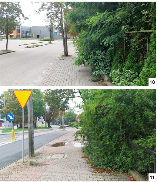 W kilku ostatnich numerach „Kurka” poruszaliśmy problem uschniętych drzew, które zagrażają bezpieczeństwu. Z niektórymi drzewami i krzewami jest wręcz przeciwnie – pod wpływem dostatku wilgoci rozrastają się i przekraczają pewne granice. Nie trzeba dużo spacerować czy jeździć, by sobie uświadomić, że ktoś zapomina o swoich obowiązkach gospodarza i zbyt rozrośniętych gałęzi nie przycina. Jeśli się zagapimy, możemy mieć na chodniku nieprzyjemne spotkanie z grochodrzewem, nazywanym u nas potocznie akacją (fot. 10) . Tak jest np. na ul. Andersa, na trotuarze przylegającym do terenu dawnego internatu przedszkolanek i późniejszego akademika. Grochodrzew przebija także przez ogrodzenie na pobliskiej ul. Chrobrego. Na tejże ulicy inny kłujący krzew zasłania znaczną część chodnika (fot. 11). I chyba warto coś z tym zrobić, zanim będą poszkodowani.
