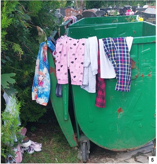 Sklepów z używaną odzieżą w Szczytnie nie brakuje. Odnosimy wrażenie, że swoje lata rozkwitu miały one jakiś czas temu, ale wciąż powstają nowe punkty sprzedaży ubrań z drugiej ręki - choć niektóre sklepy znikają. Dość nietypowe miejsce, w którym można znaleźć coś dla siebie (i to za darmo), widzieliśmy ostatnio... na szczycieńskim cmentarzu. Z jakichś niezbyt zrozumiałych powodów ktoś postanowił wywiesić wdzianka na kontenerze na śmieci i pobliskim drzewku, a buty postawić obok (fot. 5).