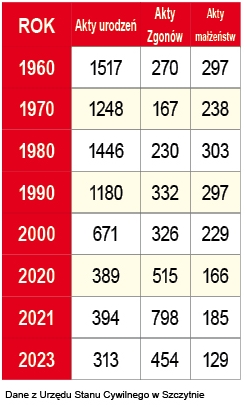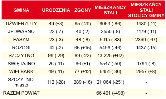 Dane demograficzne za 2023 rok nie są pocieszające. Potwierdzają, że powiat szczycieński się wyludnia. Tylko w gminie Szczytno i w Wielbarku przybyło mieszkańców. W pozostałych miastach, gminach i ich stolicach z roku na rok jest ich coraz mniej. Na szczęście w skali powiatu, w porównaniu do ostatnich lat, odnotowano mniej zgonów, chociaż w gminach Pasym, Świętajno i mieście Szczytno było ich ponaddwukrotnie więcej niż poprzednio. Nowo narodzonym ich rodzice najchętniej nadawali imiona: Pola i Zofia oraz Antoni i Stanisław.