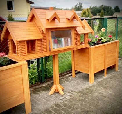 Biblioteczka Plenerowa, miejsce podarowania drugiego życia książce, stanęła przed Biblioteką Gminną w Lipowcu. Jej pracownice, także w ramach promocji czytelnictwa, z nienadających się już do użytku książek uszyły sobie … spódnice.