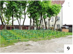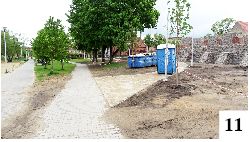 Zasadzony tutaj m.in. winobluszcz pięciolistkowy, gdy się rozrośnie, będzie wkrótce prezentował się bardziej efektownie. Nad duże jezioro powrócił król z dwiema innymi rzeźbami schowanymi na zimę magazynach MOS-u (fot. 8). Poprawa nastąpi także w naszym zapuszczonym miniamfiteatrze przy MDK-u. Zdemontowano obciachowe, rozpadające się siedziska, wymalowano pod nimi wsporniki (fot. 9) i tylko czekać na pierwsze występy w tym miejscu.