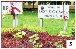 Są w Szczytnie miejsca będące symbolami pamięci o ważnych dziejowych wydarzeniach. Jednym z nich jest pomnik Orła Białego. Przy okazji kilku rocznic składane są tu wieńce – i to nie tylko przez władze samorządowe. Ostatnią okazją było Święto Konstytucji 3 Maja. W miniony weekend przestrzeń przed pomnikiem była już posprzątana. Inaczej wyglądała pobliska tablica informująca o tym, że patronem skweru jest nieżyjący od 11 lat prezydent RP Lech Kaczyński. Przy okazji kolejnych rocznic katastrofy smoleńskiej stawiane są tu znicze i składane kwiaty. Choć 11. rocznica minęła półtora miesiąca temu, ci, którzy na zawieszonej szarfie umieścili świeże kwiaty, zapomnieli, że dość szybko staną się one nieestetycznymi wiechciami (fot. 5) niepasującymi do powagi tego miejsca.