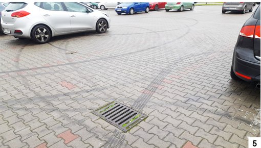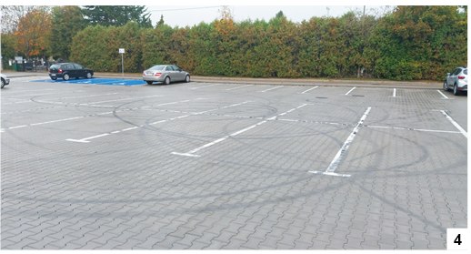 Niestety, z parkingów w pobliżu szczególnych miejsc, jakimi są cmentarze, korzystają nie tylko osoby chcące odwiedzić groby swoich swoich bliskich i zadumać się na chwilę. Na chwilę jakiejkolwiek zadumy nie stać najwyraźniej osób, które niedawno odwiedziły zmodernizowany parking. Uznały one, że to dobre miejsce, by pozostawić ślady opon i udowodnić światu, jak potrafią zapanować nad kierownicą (fot. 4) . Podobnie wygląda parking pod marketami na ul. Wileńskiej, czyli w zupełnie innej części miasta (fot. 5) . Niektóre przerośnięte dzieci muszą głośno jeździć motorami, inni dysproporcje między wiekiem i rozumem demonstrują w odmienny sposób...