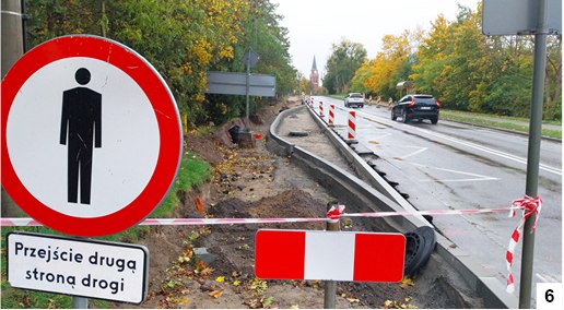Wróćmy jednak do spraw związanych z komfortem przemieszczania się w pobliżu nekropolii. Właśnie trwają dość intensywne prace drogowe na ul. Śląskiej. Chodnik od strony cmentarza został rozkopany, zrobiono miejsce pod zatoczkę dla autobusów. Zachodzi obawa, że piesi nie skorzystają na Wszystkich Świętych i w Dzień Zaduszny z tej części chodnika (fot. 6) i po drugiej stronie ulicy na wąskim trotuarze zrobi się ciasno. Być może roboty na ulicach Gizewiusza i Śląskiej (mają potrwać do marca przyszłego roku) dałoby się prowadzić tak, by nie kolidowały z pewnymi terminami w kalendarzu, ale przecież nie my decydujemy o owych terminach...