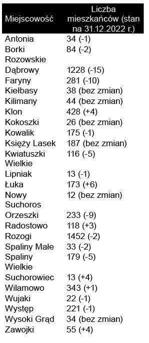 Borki Rozowskie – Danuta Kaczmarczyk, Dąbrowy I – Czesław Lis, Dąbrowy II – Halina Gleba, Faryny – Kamil Kaczmarczyk, Klon – Danuta Ruszczyk, Kowalik – Beata Kręciewska, Księży Lasek – Zdzisław Zęgota, Kwiatuszki Wielkie – Monika Darmofał, Orzeszki – Zofia Kosiorek, Radostowo – Mirosław Świder, Rozogi – Karina Pejchner, Spaliny Wielkie – Justyna Maciora, Wilamowo – Małgorzata Kamińska – Bałdyga, Występ – Jerzy Bałdyga, Zawojki – Heronim Obrębski, Łuka – Marek Soliwoda.{/akeebasubs}
