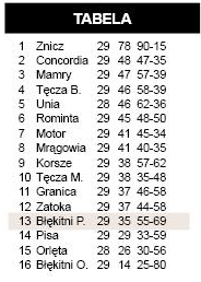 Dlaczego pasymianie nie zdobywali punktów z taką regularnością jak ostatnio, no dlaczego? Liczba strzelonych bramek daje im 6. miejsce w tabeli, ale o pozostanie w IV lidze trzeba będzie powalczyć w ostatnim meczu z Granicą. Nie bez znaczenia będą wyniki serii zamykającej sezon w III lidze.