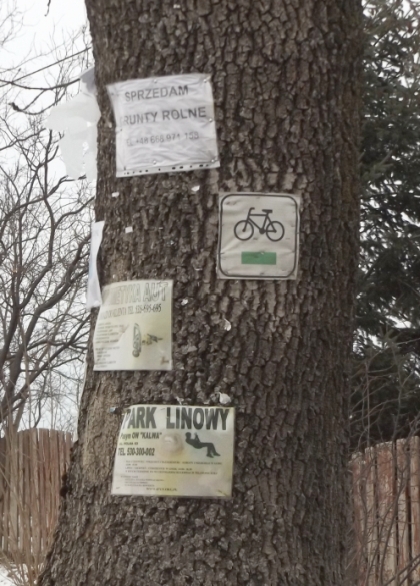 Pewnym drzewem, znajdującym się w pobliżu stacji PKP w Pasymiu, przy zjeździe w kierunku Jedwabna, nie przejmuje się chyba nikt. Klepsydry być może też są tu wywieszane, ale to spore drzewo wykorzystywane jest po prostu jako tablica ogłoszeń, na której wywiesić można, co się chce (fot. 8).