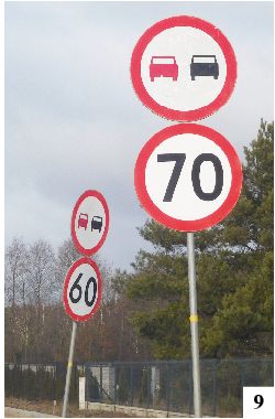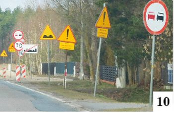 Remont drogi krajowej nr 53 ciągnie się i ciągnie, choć jakieś postępy w niektórych miejscach widać. Na sporej części równolegle poprowadzonej ścieżki rowerowej między Szczytnem i Olszynami umieszczono już krawężniki – na tę część inwestycji czeka wielu mieszkańców. Prace – jak ostatnio na mostku na Wałpuszy – prowadzone są także w niedzielę. Drogowcy w swoich poczynaniach bywają wręcz nadgorliwie dbający o bezpieczeństwo. Przy wylocie z Olszyn znaki nakazujące stopniowe ograniczenie prędkości umieszczono w odstępie góra 10 m (fot. 9) . Na odcinku raptem kilka razy dłuższym stoją za to aż trzy zakazy wyprzedzania (fot. 10).