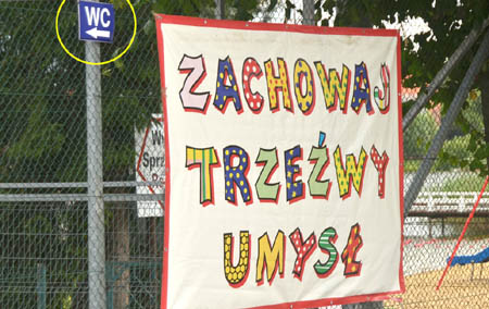 Jednym z haseł przewodnich wyżej wymienionych działań jest zawołanie: „zachowaj trzeźwy umysł”. Wymalowane ono zostało kolorowymi literami na dużym banerze i zawieszone na płocie wodnej bazy MOS-u. Treść jest jak najbardziej w porządku. Tylko strzałka umieszczona obok banera, powinna kierować zainteresowanych zabawą na trzeźwo na miejską plażę, a nie w miejsce, które pokazuje – patrz zdjęcie.