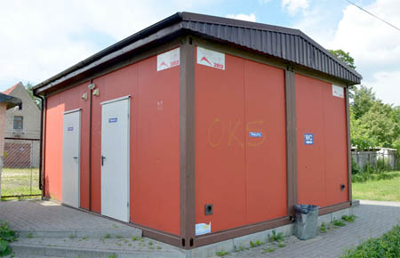 Problem z wc jest jednak poważny, bo przecież na plaży przebywa się dość długo, a wiadomo, może akurat przypilić w najmniej spodziewanym momencie. Na szczęście toalety są w pobliżu kąpielisk, o czym informują właśnie białe strzałki na niebieskich tabliczkach. Wskazują one czerwony przybytek posadowiony na terenie pobliskiego boiska – orlika. Sprawdziliśmy obiekt – otwarte są tylko drzwi po lewej stronie zdjęcia. Czyli wc ma charakter koedukacyjny, damsko-męski. Wewnątrz nie ma luksusów, ale ogólnie jest czysto. Domek ma też pomieszczenia typu szatanie, do których wejścia zostały usytuowane od strony bazy wodnej. Pomyśleliśmy, że świetnie nadawałaby się na plażowe przebieralnie, ale niestety, drzwi do tych pomieszczeń pozostają zamknięte na głucho.